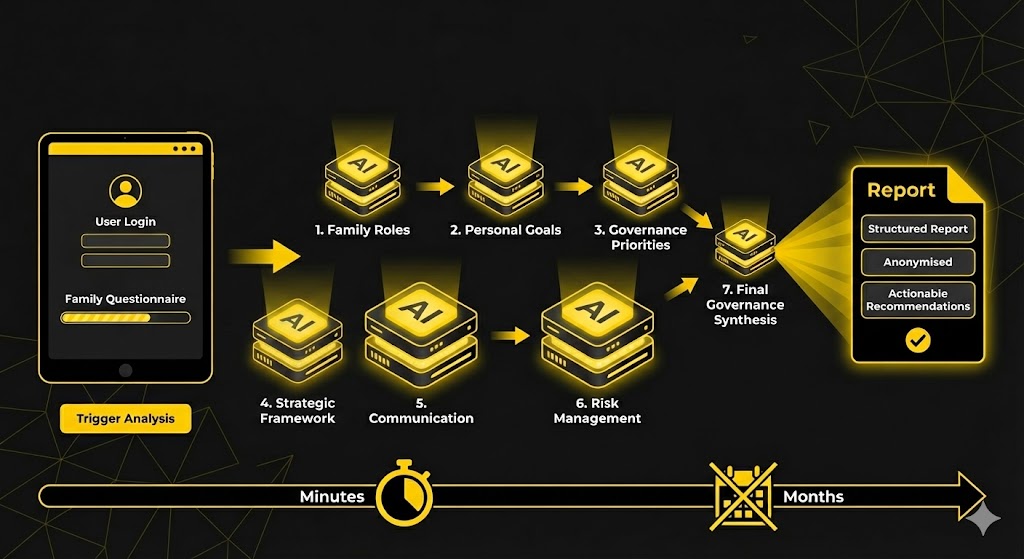 The core of the platform - 7 specialised agents. Each receives questionnaire responses, applies its own prompts, and analyses a specific governance dimension. The final agent consolidates everything into a single PDF report.